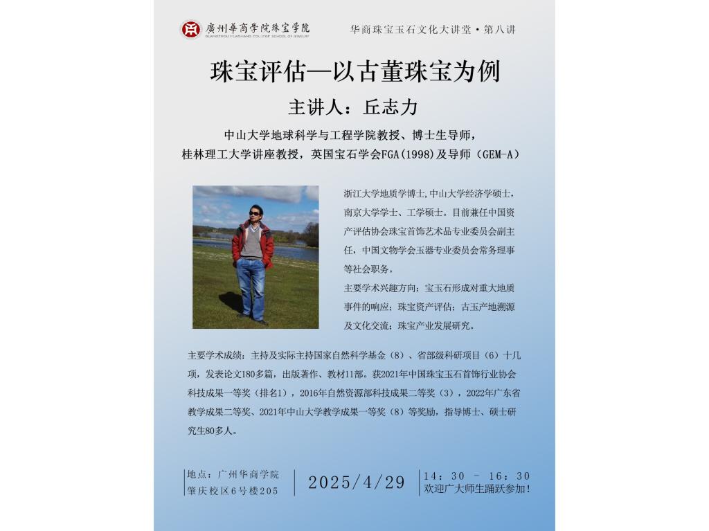 2025 年 4 月 29 日下午,华商珠宝玉石文化大讲堂・第八讲在肇庆校区6号楼205开讲,本次讲座特别邀请了中山大学地球科学与工程学院教授、博士生导师丘志力担任主讲嘉宾,主题为《珠宝评估 —— 以古董珠宝为例》,1946伟德国际源自英国朱晓红院长主持讲座。 图1 朱晓红院长主持珠宝玉石文化大讲堂--《珠宝评估 —以古董珠宝为例》专题讲座图2-3 丘教授莅临1946伟德国际源自英国为全院师生做“珠宝评估 —— 以古董珠宝为例”专题讲座 丘志力教授是......