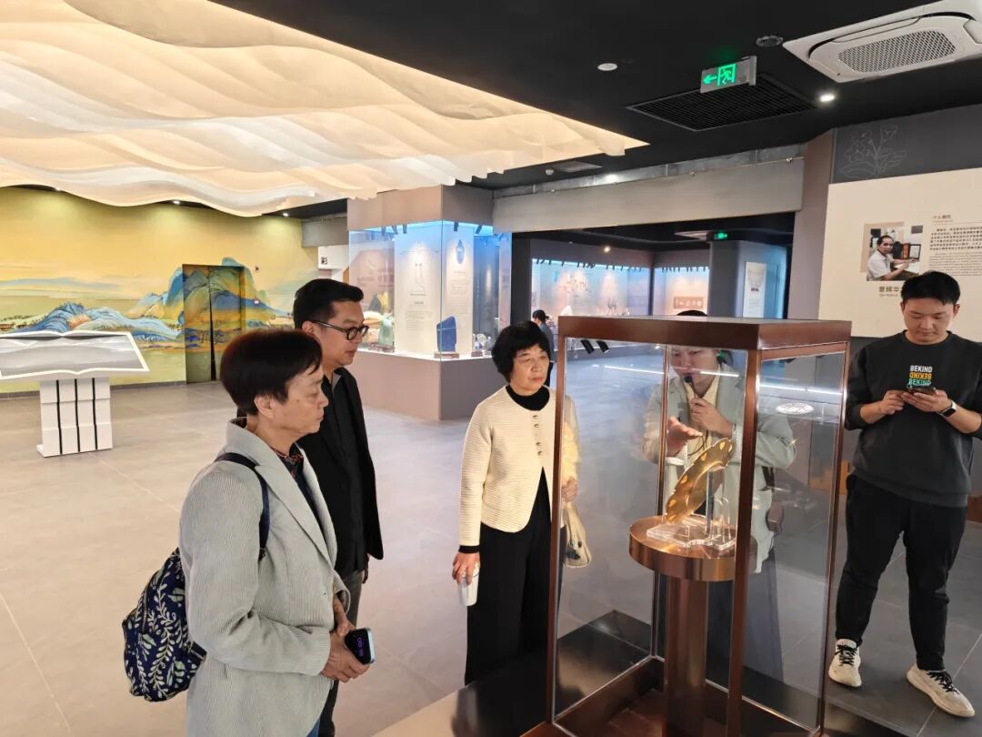 走访中,博物馆的特色馆藏让团队成员眼前一亮,《湾区同心》花丝作品:800 段金线的精细编织,不仅展现了非遗技艺的魅力,更成为 “珠宝工艺史”“材料学” 课程的鲜活案例。《千里江山图》矿石墙绘,蓝铜矿、孔雀石等天然矿物的色彩运用,也让大家了解了中国色彩的文化基因。