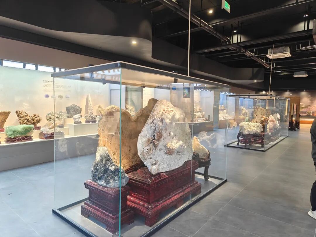 在博物馆负责人的细致讲解下,学院领导团队实地考察博物馆 6000㎡展区的动线设计,从矿物科普区的 “沉浸式自然课堂”,到非遗传承展区的 “技艺体验空间”,再到世赛成果区的 “工艺展示平台”,深入了解博物馆 藏品的征集、分类与管理体系。