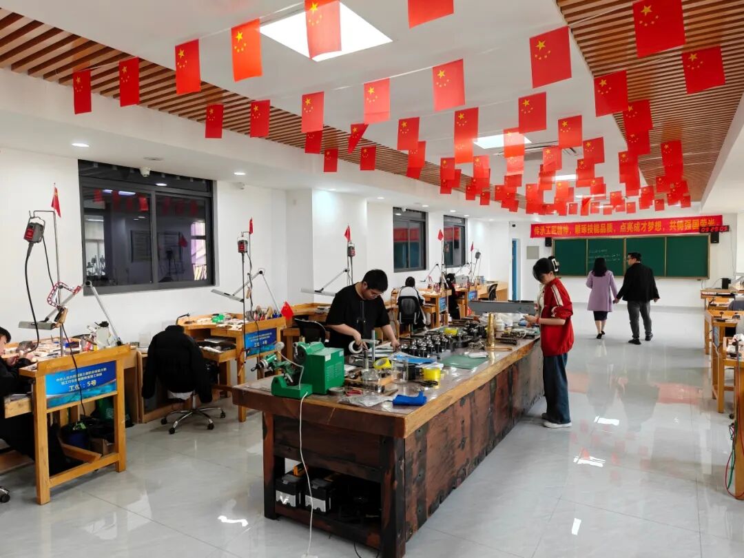 离开博物馆,学院领导团队前往广州南华工贸技师学院,聚焦 “珠宝技工培养体系”,深入学习其在技能人才培育方面的先进经验,在南华工贸技师学院负责人的陪同下,团队走进实训车间、教学课堂,实地参观珠宝首饰设计、制作、鉴定等实训车间。