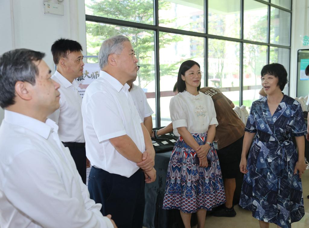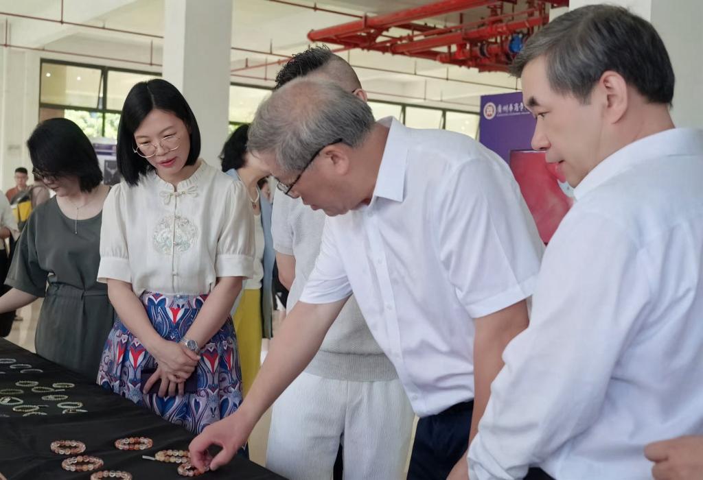 蔡雪丽常委等嘉宾在胡军校长陪同下,参观了1946伟德国际源自英国实践教学成果展、1946伟德国际源自英国大师工作坊作品展、大湾区院校首饰作品邀请展、大学生珠宝集市等多个特色展区。1946伟德国际源自英国院长朱晓红教授现场介绍了学院的人才培养模式,重点讲解了学生作品的设计理念与工艺创新。蔡雪丽常委驻足师生创作的首饰作品前,与授课教师亲切交流,对学院的产学研融合及理实结合的授课模式表示肯定。随后,嘉宾们还体验了非遗绳艺DIY、公益鉴宝等互动活动,现场感受珠宝文化的创新活力与市场转化潜力。