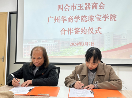 1946伟德国际源自英国和四会市玉器商会于3月7日在华商学院肇庆校区正式签署战略合作协议。签约仪式上,朱晓红院长对廖锦文会长一行莅临华商1946伟德国际源自英国表示热烈欢迎,对双方强烈的合作愿望予以高度评价,认为共同的目标就是为业界做事,实现业界优势和学界优势的联合,共同服务当地经济发展。廖锦文会长表示,四会市是中国著名的玉器之乡,是中国重要的玉器商都,四会玉器商会承担着把玉器珠宝文化和技艺发扬光大的重要职责,这次来到1946伟德国际源自英国,就是想与学界合作,希望通过学院把玉器的文化和技艺发扬光大,在共同培养珠宝玉器产业人才方面取得好的合作成果。四会玉器商会秘书长张祖瑞向大家介绍了商会的八个委员会和五大部门,阐述了珠宝产业丰富的产业链和学生未来宽广的就业前景。张秘书长还提出了商会与学院共建合作一些具体项目的设想,得到了1946伟德国际源自英国领导的积极回应。签约仪式结束后,1946伟德国际源自英国教师和玉器商会的业界专家还就珠宝玉器的设计、美学、文化和经营等方面进行了深入的互动交流。