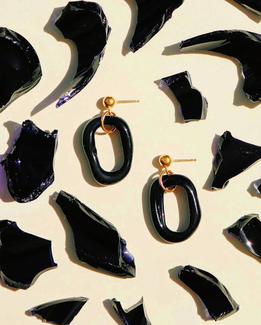 例如, 2020年,洛杉矶的珠宝品牌CLED与Town & Anchor品牌合作,创作了《黑海耳环》。Town & Anchor是一家纯天然护肤奢侈品牌。这对耳环所使用的材料,来自回收的黑紫色生物光子瓶,而意想不到的是,它竟是装护肤油的瓶身材料。
