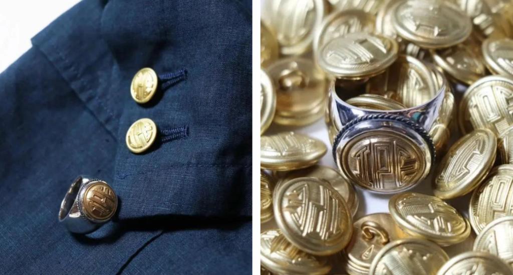 例如:Buton Works品牌忠于对古着物品与古老技术的应用和使用,譬如旧服装零件、银币、广告纸等等材料,都被重新打造成了包装袋、饰品、家具摆设等。这款戒指是用古着服饰上的纽扣打造的戒指,通过对旧衣零件的纽扣、拉链等配件进行再设计,将这些已经被废弃的“边角料”重新以现代着装的形式重新回到人们的生活中,就是Button Works 创始人的初衷。